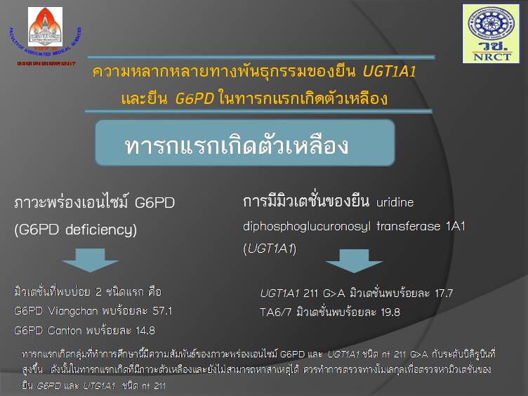 | Keyword | ภาวะตัวเหลืองในทารกแรกเกิด, ยีน G6PD, ยีน UGT1A1 |