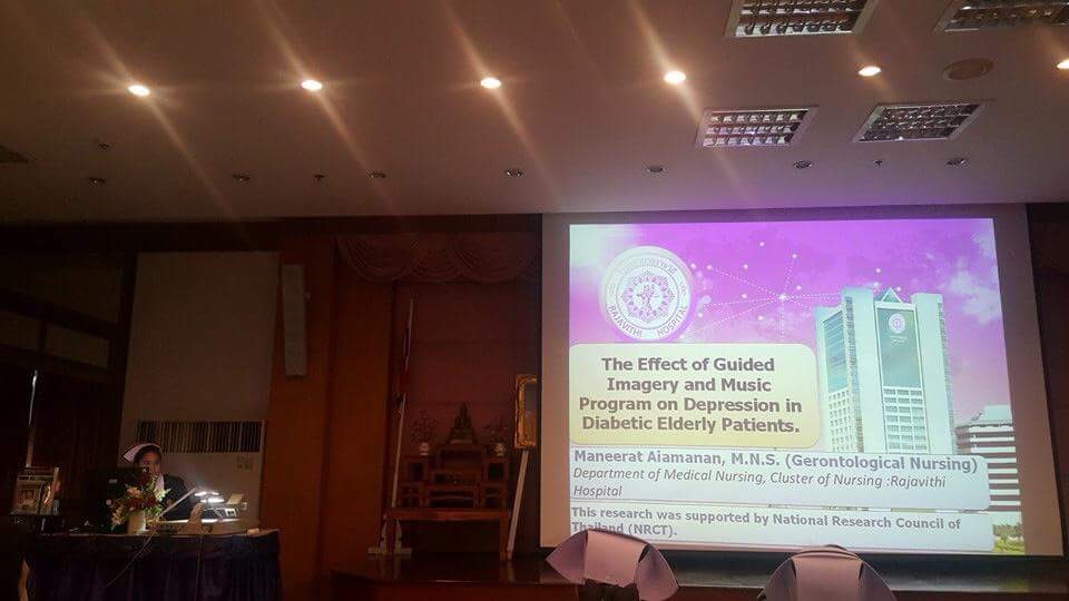 | Description | โปรแกรมการสร้างจินตภาพร่วมกับดนตรีสามารถช่วยลดภาวะซึมเศร้าในผู้สูงอายุโรคเบาหวานที่มีภาวะซึมเศร้าได้ โดยการสร้างจินตภาพร่วมกับดนตรีช่วยให้เกิดความรู้สึกผ่อนคลายแบบลึก จากเสียงของดนตรีร่วมกับการสร้างจินตภาพ (Imagery) เกิดความรู้สึกมีคุณค่าในตนเอง และอารมณ์ดีขึ้น ซึ่งควรนำโปรแกรมการสร้างจินตภาพร่วมกับดนตรีนี้ไปใช้ในการลดภาวะซึมเศร้าของผู้สูงอายุโรคเบาหวาน |
