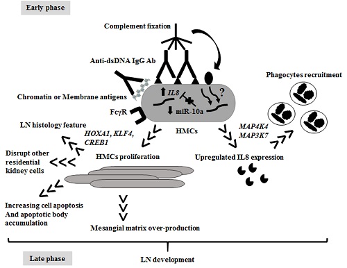 | Description | In the early phase, auto antibodies (Ab) attach to chromatin structure or membrane antigens on human mesangial cell (HMC) membranes inducing complement fixation. The miR-10a is downregulated and enhances cell proliferation or apoptosis through HOXA1, KLF4,and CREB1. IL8 or CXCL8 are putative direct targets of miR-10a. The IL-8 attracts phagocytes into the kidney. HMCs interact with endothelial cells and the glomerular basement membrane, and abnormal functions of HMCs might disturb other resident kidney cell functions. The increase in HMC number might increase mesangial matrixes resulting in chromatin or apoptotic body accumulation. In summary, these processes might drive the progression of lupus nephritis (LN) disease and provide insights into LN pathogenesis. |