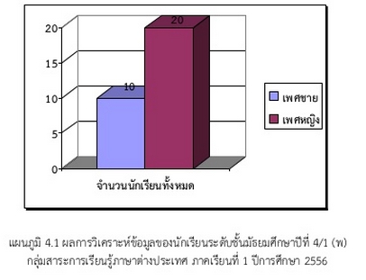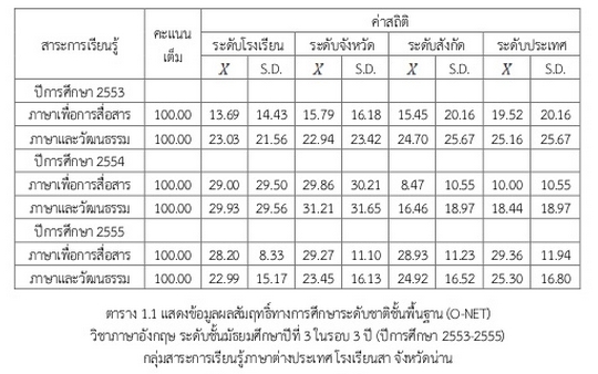 | Description | ศึกษาผลสัมฤทธิ์ของการจัดกิจกรรมการเรียนการสอนรายวิชาภาษาอังกฤษอ่าน-เขียน 1 รหัสวิชา อ30205 ชั้นมัธยมศึกษาปีที่ 4/1(พ) ภาคเรียนที่ 1 ปีการศึกษา 2556 ในกลุ่มสาระการเรียรู้ภาษาต่างประเทศ โรงเรียนสา อำเภอเวียงสา จังหวัดน่าน และพัฒนาทักษะการอ่านและการเขียนภาษาอังกฤษของนักเรียนระดับมัธยมศึกษาปีที่ 4/1(พ)รายวิชาภาษาอังกฤษ อ่าน-เขียน 1 รหัสวิชา อ30205 กลุ่มสาระการเรียนรู้ภาษาต่างประเทศ พบว่า นักเรียนชั้นมัธยมศึกษาปีที่ 4/1(พ) มีคะแนนผลสัมฤทธิ์ทางการเรียนรายวิชาภาษาอังกฤษอ่าน-เขียน 1 รหัสวิชา อ 30205 หน่วยการเรียนรู้ที่ 1 : Reading Variety เรื่อง Wiang Sa My Homeland ระดับชั้นมัธยมศึกษาปีที่ 4/1(พ) กลุ่มสาระการเรียนรู้ภาษาต่างประเทศ โดยการเปรียบเทียบคะแนนก่อนเรียนและหลังเรียน พบว่านักเรียนทั้งหมดมีพัฒนาการเรียนที่ดีขึ้น คะแนนผลสัมฤทธิ์ก่อนเรียนมีค่าเฉลี่ยร้อยละ 51.30 ส่วนผลสัมฤทธิ์หลังเรียนมีค่าเฉลี่ยรวมร้อยละ 81.43 ซึ่งทั้งหมดมีคะแนนค่าเฉลี่ยความก้าวหน้าอยู่ที่ 30.13 คิดเป็น 15.06 % |