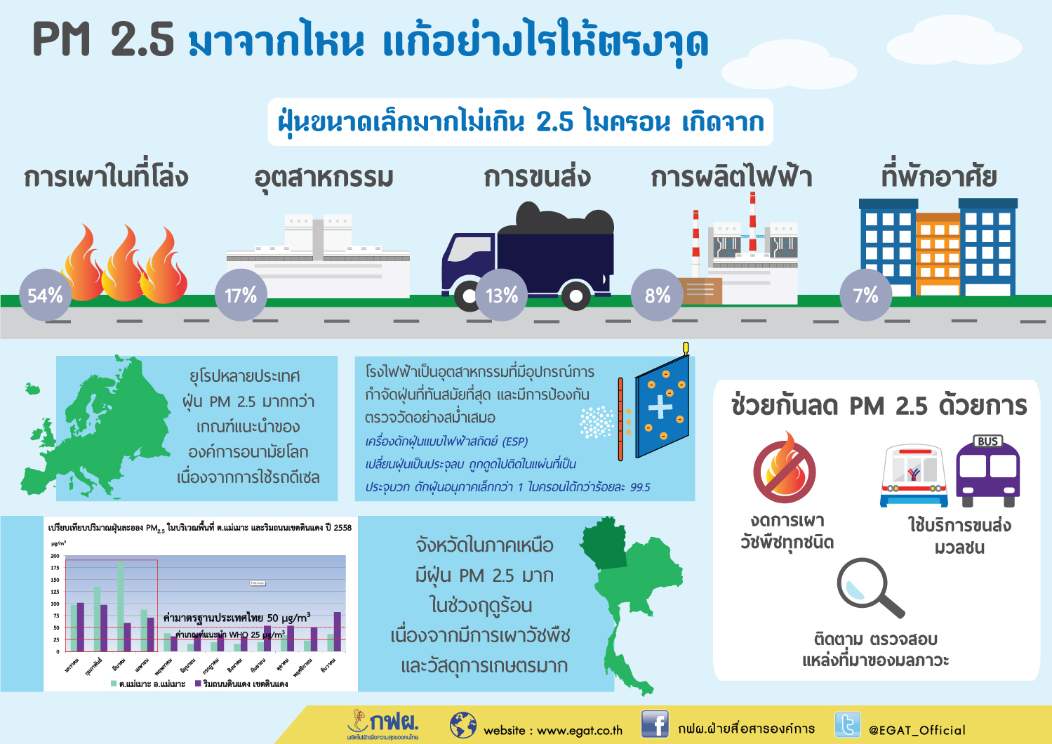 | Description | ฝุ่นขนาดเล็กไม่เกิน 2.5 ไมครอน หรือ PM 2.5 หากจะพูดภาษาบ้านๆ ก็คือ ฝุ่นละเอียดกลายเป็นชื่อที่คุ้นหูคนไทยมากขึ้น มีลักษณะเป็นเขม่าควัน หรือไอเสียจากการเผาเชื้อเพลิงต่างๆ ซึ่งเป็นอันตรายเพราะสามารถเข้าสู่ร่างกายของคนเราทางการหายใจได้มากกว่าฝุ่นขนาดใหญ่ สาเหตุของการเกิด PM 2.5 ในประเทศไทยมาจาก การเผาในที่โล่งเป็นแหล่งกำเนิดของ PM2.5 มากที่สุด ตามด้วยอุตสาหกรรมการผลิตและการขนส่ง โดยภาคการผลิตไฟฟ้านั้นเป็นแหล่งกำเนิด PM2.5 ในอันดับที่ 4 สำหรับการแก้ไขปัญหาเรื่องมลพิษ ฝุ่นขนาดเล็ก PM2.5 จึงควรมองให้ตรงประเด็นและแก้ปัญหาให้ตรงจุด โดยเฉพาะการงดการเผาในที่โล่ง การส่งเสริมการใช้บริการขนส่งมวลชน และลดการใช้รถยนต์ส่วนตัว รวมถึงการติดตาม ตรวจสอบ แหล่งที่มาของมลภาวะทางอากาศจากแหล่งต่างๆ |