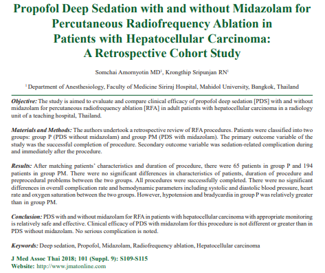 | Description | Propofol deep sedation (PDS) with and without midazolam for percutaneous radiofrequency ablation in patients with hepatocellular carcinoma with appropriate monitoring is relatively safe and effective. Clinical efficacy of PDS with midazolam for this procedure is not different or greater than in PDS without midazolam. No serious complication is noted. |