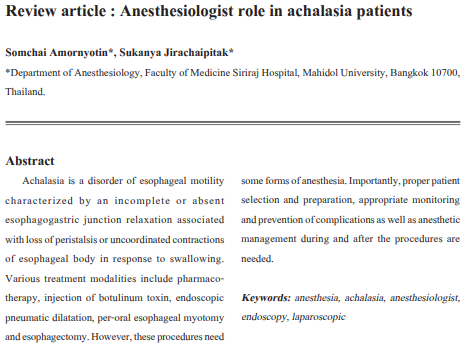 Description Achalasia is a disorder of esophageal motility characterized by an incomplete or absent esophagogastric junction relaxation associated with loss of peristalsis or uncoordinated contractions of esophageal body in response to swallowing. Various treatment modalities include pharmacotherapy, injection of botulinum toxin, endoscopic pneumatic dilatation, per-oral esophageal myotomy and esophagectomy. However, these procedures need some forms of anesthesia. Importantly, proper patient selection and preparation, appropriate monitoring and prevention of complications as well as anesthetic management during and after the procedures are needed.