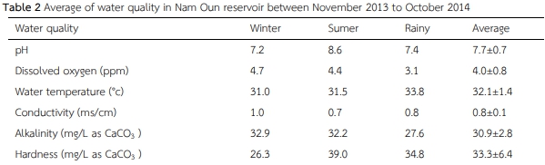 ความชุกชุมของหอยฝาเดียวน้ำจืดและความสัมพันธ์ระหว่างคุณภาพน้ำ บริเวณอ่างเก็บน้ำเขื่อนน้ำอูน จังหวัดสกลนคร