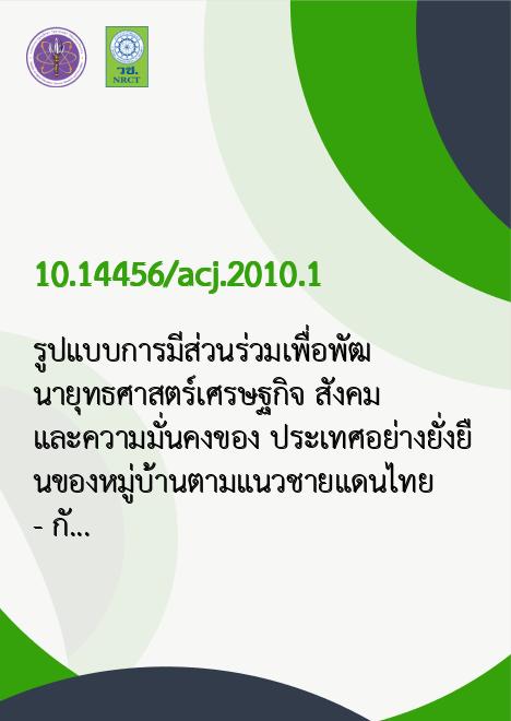 | Title | รูปแบบการมีส่วนร่วมเพื่อพัฒนายุทธศาสตร์เศรษฐกิจ สังคม และความมั่นคงของ ประเทศอย่างยั่งยืนของหมู่บ้านตามแนวชายแดนไทย – กัมพูชาภาคตะวันออก เฉียงเหนือตอนล่าง เพื่อรองรับแนวนโยบายด้านการบริหารราชการแผ่นดิน ในการ สนับสนุนให้จังหวัดมีแผนและงบประมาณเพื่อพัฒนาจังหวัดตามรัฐธรรมนูญแห่ง ราชอาณาจักรไทย พุทธศักราช 2550 |
