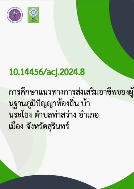 การศึกษาแนวทางการส่งเสริมอาชีพของผู้สูงอายุบนฐานภูมิปัญญาท้องถิ่น บ้านระโยง ตำบลท่าสว่าง อำเภอเมือง จังหวัดสุรินทร์ |