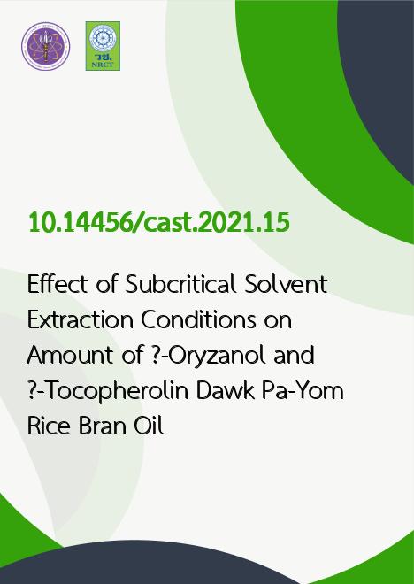 Effect of Subcritical Solvent Extraction Conditions on Amount of ?-Oryzanol and ?-Tocopherolin Dawk Pa-Yom Rice Bran Oil |