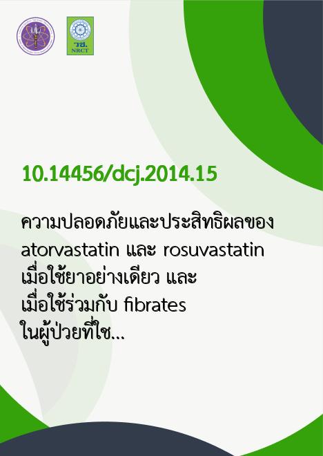 | Abstract | การศึกษานี้มีวัตถุประสงค์เพื่อหาอัตราการเกิดอาการไม่พึงประสงค์และเปรียบเทียบประสิทธิผลของยา atorvastatin และ rosuvastatin เมื่อใช้อย่างเดียว และเมื่อใช้ร่วมกับ fibrates (gemfibrozil และ fenofibrate) ในการลดระดับ low-density lipoprotein cholesterol (LDL-C) และการบรรลุเป้าหมายในการรักษาตามแนวทางของ National Cholesterol Education Program (NCEP) Adult Treament Panell III (ATP III) ในผู้ป่วยที่กำลังใช้ยา boosted protease inhibitors (boosted Pls) หรือ Pls ที่มารับการรักษาที่สถาบันบำราศนราดูร โดยเก็บข้อมูลย้อนหลังจากเวชระเบียนของผู้ป่วยที่มารับการรักษา ระหว่างวันที่ 1 มกราคม 2553 ถึง 30 มิถุนายน 2555 ผู้ป่วยมีอายุตั้งแต่ 18 ปีขึ้นไป ในวันที่เริ่มใช้ statins (atorvastatin หรือ rosuvastatin) มีผลของ LDL-C อย่างน้อย 2 ครั้ง คือ ภายใน 3 เดือนก่อนเริ่มใช้ยา statins ร่วมกับยา boosted Pls หรือ Pls และหลังจากใช้ยาร่วมกันอย่างน้อย 3 เดือน ช่วงระยะเวลา 3 เดือนก่อนเริ่มยา boosted Pls หรือ Pls ไม่ได้ใช้ยา statins และเก็บรวบรวมข้อมูลก่อนและหลังการใช้ยา boosted Pls ร่วมกับ statins อย่างน้อย 1 ปี ผลการศึกษารายงานเป็นอัตราการเกิดอาการไม่พึงประสงค์และประสิทธิผลของ atorvastatin และ rosuvastatin รายงานเป็นค่าเฉลี่ยร้อยละของ LDL-C ที่ลดลง และร้อยละของการบรรลุเป้าหมายตาม NCEP ATP III ผู้ป่วยที่อยู่ในเกณฑ์มี 116 ราย อายุเฉลี่ย 45 ปี เป็นชาย 82 ราย และหญิง 34 ราย กลุ่มที่ใช้ atorvastatin 53 ราย ใช้ gemfibrozil และ fenofibrate อย่างละ 14 ราย กลุ่มที่ใช้ rosuvastatin 63 ราย ใช้ gemfibrozil 14 ราย และ fenofibrate 15 ราย ผู้ป่วย 116 ราย เกิดอาการไม่พึงประสงค์ (AEs) 4 ราย (ร้อยละ 3.5) ได้แก่ ปวดเมื่อยกล้ามเนื้อ 2 ราย หยุดยาทั้ง 2 ราย อีก 2 รายมีค่า creatine phosphokinase (CPK) >2 เท่า ของ upper limit of normal value (ULN) แต่ไม่ได้หยุดยา ในจำนวนนี้ 3 ราย ใช้ lopinavir/ritronavir และ 1 ราย ใช้ lopinavir/atazanavir/ritronavir ทุกรายใช้ rosuvastatin 10 mg. โดย 3 รายใช้ร่วมกับ gemfibrozil และ 1 รายใช้ร่วมกับ fenofibrate ประสิทธิผลของการใช้ยา 3 เดือน ถึง 1 ปี ผู้ป่วยทั้งหมด 116 ราย พบว่า rosuvastatin ลด LDL-C ได้มากกว่า atorvastatin (ร้อยละ 33.0 และ ร้อยละ 24.1, p=0.015) และได้ผลบรรลุเป้าหมายมากกว่า atorvastatin (OR = 2.23, p = 0.036) การใช้ rosuvastain หรือ atorvastatin ร่วมกับ gemfibrozil หรือ fenofibrate ไม่ได้ทำให้ผลของการลดระดับ LDL-C ของ rosuvastatin หรือ atoravastatin ต่างจากการใช้ rosuvastain หรือ atorvastatin อย่างเดียว (p = 0.619 และ 0.395 ตามลำดับ) เช่นเดียวกับการบรรลุ LDL-C goal (p = 0.314 และ 0.185 ตามลำดับ) กลุ่มที่ไม่ได้ใช้ gemfibrozil หรือ fenofibrate ยา rosuvastatin ลดระดับ LDL-C ได้มากกว่า atorvastatin (ร้อยละ 34.9 และร้อยละ 22.9, P = 0.025) และบรรลุเป้าหมายมากกว่า (OR = 4.27, P = 0.008) กลุ่มที่ใช้ gemfibrozil หรือ fenofibrate ด้วย พบว่า rosuvastatin และ atorvastatin ลด LDL-C ได้ไม่ต่างกัน (p = 0.778 และ 0.235 ตามลำดับ) และบรรลุเป้าหมายไม่ต่างกัน (OR = 2.75, P = 0.225 และ OR = 0.64, P = 0.550 ตามลำดับ) โดยสรุป ถ้าจำเป็นต้องใช้ atorvastatin หรือ rosuvastatin ร่วมกับ gemfibrozil หรือ fenofibrate น่าจะเลือกใช้ atorvastatin เพราะจะปลอดภัยกว่า และการใช้ gemfibrozil หรือ fenofibrate ร่วมกับ atorvastatin หรือ rosuvastatin ไม่มีผลต่อ