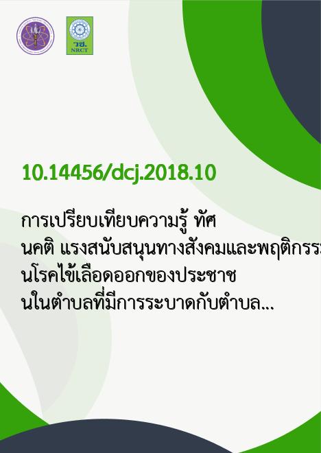 การเปรียบเทียบความรู้ ทัศนคติ แรงสนับสนุนทางสังคมและพฤติกรรมการป้องกันโรคไข้เลือดออกของประชาชนในตำบลที่มีการระบาดกับตำบลที่ไม่มีการระบาด ในพื้นที่อำเภอมะขาม จังหวัดจันทบุรี |