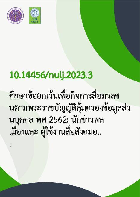 | Title | ศึกษาข้อยกเว้นเพื่อกิจการสื่อมวลชนตามพระราชบัญญัติคุ้มครองข้อมูลส่วนบุคคล พ.ศ. 2562: นักข่าวพลเมืองและ ผู้ใช้งานสื่อสังคมออนไลน์ |