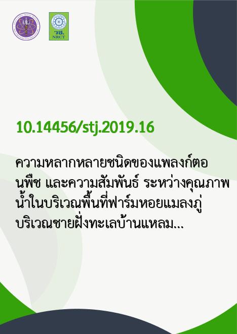 Abstract การศึกษาความหลากหลายของแพลงก์ตอนพืชบริเวณพื้นที่ชายฝั่งอ่าวบางตะบูน อ.บ้านแหลม จ.เพชรบุรีซึ่งเป็นพื้นที่ฟาร์มหอยแมลงภู่ และความสัมพันธ์ระหว่างคุณภาพน้ำกับปริมาณแพลงก์ตอนพืช โดยเก็บตัวอย่างในเดือนพฤศจิกายน 2559 พบแพลงก์ตอนพืชทั้งหมด 35 ชนิดโดยพบแพลงก์ตอนพืชกลุ่มไดโนแฟลก เจลเลตมีปริมาณมากที่สุด และพบว่าไดอะตอมมีความหลากหลายชนิดมากที่สุด ไดอะตอมชนิดเด่นที่พบ คือ Cyclotella sp. และ Coscinodiscus sp. สาหร่ายสีน้ำเงินแกมเขียวที่พบคือ Oscillatoria sp. และ กลุ่มไดโนแฟลก เจลเลต ที่พบคือ Ceratium furca ซึ่งมีปริมาณมากที่สุด ค่าดัชนีความหลากหลายของชนิด ค่าดัชนีความสม่ำเสมอ และค่าดัชนีความมากชนิดของแพลงก์ตอนพืชมีค่าเท่ากับ 0.34 , 0.098 และ 3.56 ตามลำดับ ค่าเฉลี่ยคุณภาพน้ำชายฝั่งอ่าวบางตะบูนยังอยู่เกณฑ์มาตรฐานที่กำหนดยกเว้นฟอสเฟตกับแอมโมเนียม ส่วนการวิเคราะห์หาความสัมพันธ์ระหว่างคุณภาพน้ำกับปริมาณแพลงก์ตอนพืช พบว่าแพลงก์ตอนพืชบริเวณชายฝั่งทะเลอ่าวบางตะบูน มีความสัมพันธ์ในระดับปานกลางกับแอมโมเนียม ส่วนกับพารามิเตอร์อื่น ๆ มีความสัมพันธ์น้อย แต่เมื่อดูความสัมพันธ์กับปัจจัยอื่น ๆ ได้แก่ แคลเซียมซิลิเกตมีความสัมพันธ์ในทางเดียวกันอย่างมีนัยสำคัญทางสถิติที่ระดับความเชื่อมั่นร้อยละ 99 กับปริมาณฟอสเฟต และมีความสัมพันธ์ในทางตรงกันข้ามกับค่าความเป็นกรด-ด่างอย่างมีนัยสำคัญทางสถิติที่ระดับความเชื่อมั่นร้อยละ 95
