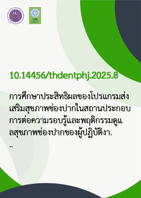 | Abstract | การศึกษานี้มีวัตถุประสงค์เพื่อประเมินประสิทธิผลของโปรแกรมสร้างเสริมสุขภาพช่องปากในสถานประกอบการ ผ่านการวัดระดับความรอบรู้และพฤติกรรมดูแลสุขภาพช่องปากของผู้ปฏิบัติงาน สุ่มกลุ่มตัวอย่างแบบสองชั้นภูมิ โดยชั้นที่ 1 สุ่มสถานประกอบการแบบเฉพาะเจาะจง และชั้นที่ 2 สุ่มผู้ปฏิบัติงานแบบบังเอิญจากผู้ปฏิบัติงานในสถานประกอบการที่มีการดำเนินงานสร้างเสริมสุขภาพช่องปากต่อเนื่องอย่างน้อย 2 ปี และสถานประกอบการที่ไม่มีการดำเนินงานดังกล่าว กลุ่มละ 9 แห่ง จำนวนทั้งหมด 678 คน เก็บข้อมูลระหว่างวันที่ 1 - 30 กันยายน 2567 โดยการตอบแบบสอบถามด้วยตนเองในแบบฟอร์มอิเล็กทรอนิกส์ วิเคราะห์ข้อมูลทั่วไป ข้อมูลความรอบรู้ด้านสุขภาพช่องปาก และข้อมูลพฤติกรรมดูแลสุขภาพช่องปาก โดยใช้สถิติเชิงพรรณนา และเปรียบเทียบข้อมูลระหว่างกลุ่มผู้ปฏิบัติงานในสถานประกอบการที่มีการดำเนินงาน และไม่มีการดำเนินงานสร้างเสริมสุขภาพช่องปาก โดยใช้สถิติ independent samples t-test ผลการศึกษาพบว่า สถานประกอบการที่มีการดำเนินงาน และไม่มีการดำเนินโปรแกรมสร้างเสริมสุขภาพช่องปาก มีผู้ปฏิบัติงานที่มีความรอบรู้ด้านสุขภาพช่องปากเพียงพอ ร้อยละ 70.8 และ 50.5 ตามลำดับ และมีคะแนนความรอบรู้ด้านสุขภาพช่องปากเฉลี่ย 91.4 และ 79.9 คะแนน ตามลำดับ (จากคะแนนเต็ม 136 คะแนน) ซึ่งมีความแตกต่างอย่างมีนัยสำคัญทางสถิติ (p < 0.001) นอกจากนี้ สถานประกอบการที่มีการดำเนินงานสร้างเสริมสุขภาพช่องปาก ยังพบผู้ปฏิบัติงานมีพฤติกรรมแปรงฟันนานอย่างน้อย 2 นาที ร้อยละ 67.0 และไปพบทันตแพทย์ในปีที่ผ่านมา ร้อยละ 90.3 ซึ่งสูงกว่าสถานประกอบการที่ไม่มีการดำเนินโปรแกรมสร้างเสริมสุขภาพช่องปาก ที่พบการแสดงพฤติกรรมดังกล่าวเพียงร้อยละ 12.8 และ 29.8 ตามลำดับ ซึ่งมีความแตกต่างอย่างที่ระดับนัยสำคัญทางสถิติ (p < 0.001) ผลลัพธ์ที่เกิดขึ้นนี้ แสดงให้เห็นถึงประโยชน์ของโปรแกรมสร้างเสริมสุขภาพช่องปากที่ส่งผลต่อความรอบรู้ และพฤติกรรมดูแลสุขภาพช่องปากผู้ปฏิบัติงานในสถานประกอบการที่ร่วมโครงการ |