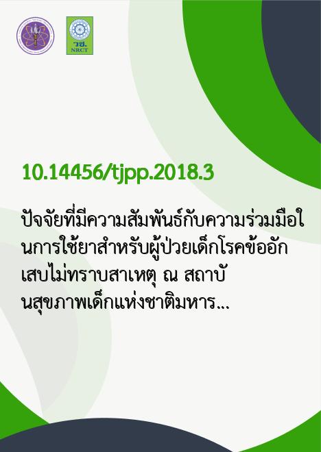 ปัจจัยที่มีความสัมพันธ์กับความร่วมมือในการใช้ยาสำหรับผู้ป่วยเด็กโรคข้ออักเสบไม่ทราบสาเหตุ ณ สถาบันสุขภาพเด็กแห่งชาติมหาราชินี |