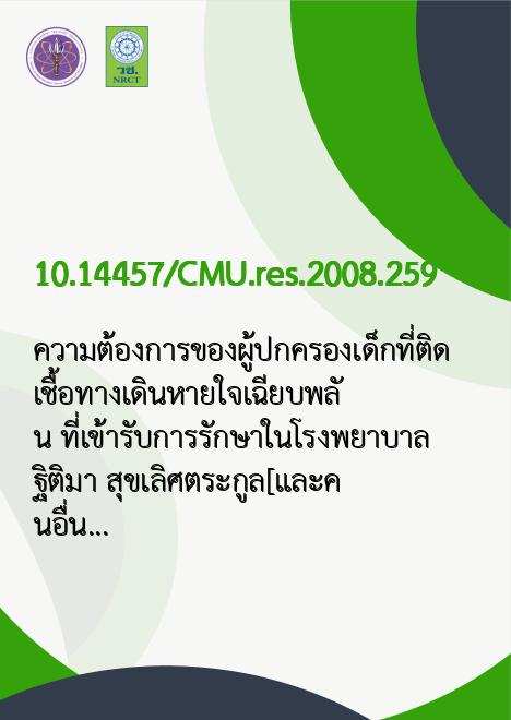 ความต้องการของผู้ปกครองเด็กที่ติดเชื้อทางเดินหายใจเฉียบพลัน ที่เข้ารับการรักษาในโรงพยาบาล /ฐิติมา สุขเลิศตระกูล...[และคนอื่นๆ] |