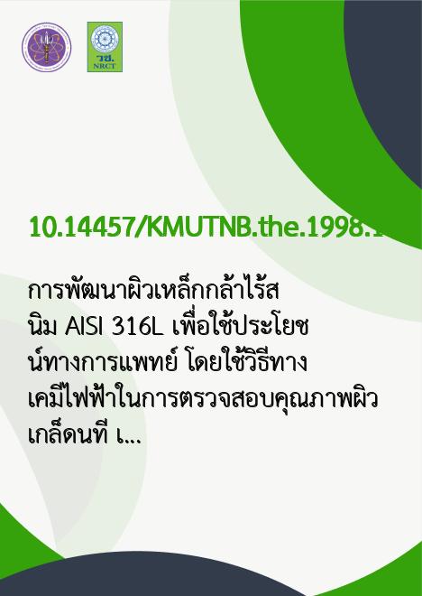 การพัฒนาผิวเหล็กกล้าไร้สนิม AISI 316L เพื่อใช้ประโยชน์ทางการแพทย์ โดยใช้วิธีทางเคมีไฟฟ้าในการตรวจสอบคุณภาพผิว /เกล็ดนที เวปุลานนท์ |