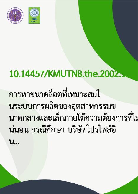 | Title | การหาขนาดล็อตที่เหมาะสมในระบบการผลิตของอุตสาหกรรมขนาดกลางและเล็กภายใต้ความต้องการที่ไม่แน่นอน กรณีศึกษา บริษัทโปรไฟล์อินดัสตรี จำกัด / |