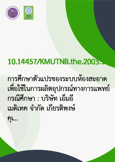 Title การศึกษาตัวแปรของระบบห้องสะอาดเพื่อใช้ในการผลิตอุปกรณ์ทางการแพทย์ กรณีศึกษา : บริษัท เอ็ม.อี.เมดิเทค จำกัด /