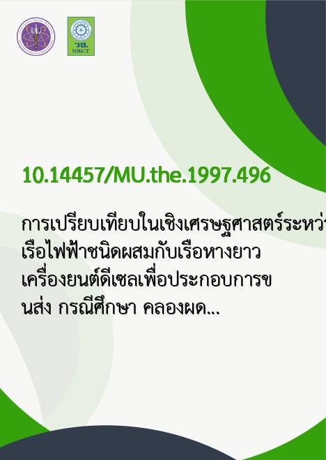การเปรียบเทียบในเชิงเศรษฐศาสตร์ระหว่างเรือไฟฟ้าชนิดผสมกับเรือหางยาว เครื่องยนต์ดีเซลเพื่อประกอบการขนส่ง กรณีศึกษา คลองผดุงกรุงเกษม |