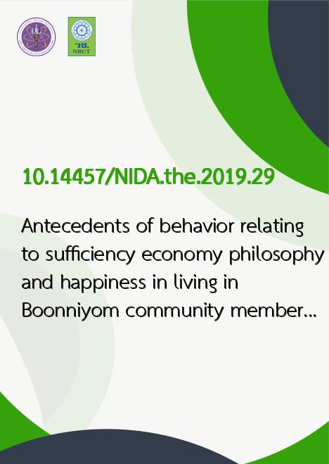 | Title | Antecedents of behavior relating to sufficiency economy philosophy and happiness in living in Boonniyom community members |