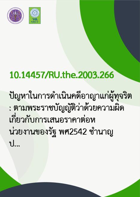 | Title | ปัญหาในการดำเนินคดีอาญาแก่ผู้ทุจริต : ตามพระราชบัญญัติว่าด้วยความผิดเกี่ยวกับการเสนอราคาต่อหน่วยงานของรัฐ พ.ศ.2542 / |