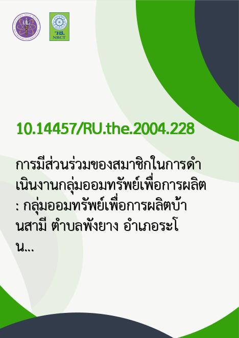| Title | การมีส่วนร่วมของสมาชิกในการดำเนินงานกลุ่มออมทรัพย์เพื่อการผลิต : กลุ่มออมทรัพย์เพื่อการผลิตบ้านสามี ตำบลพังยาง อำเภอระโนด จังหวัดสงขลา / |