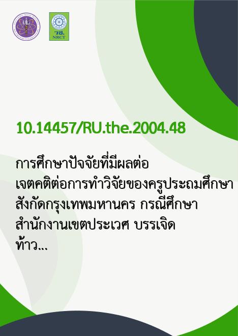 การศึกษาปัจจัยที่มีผลต่อเจตคติต่อการทำวิจัยของครูประถมศึกษา สังกัดกรุงเทพมหานคร กรณีศึกษา สำนักงานเขตประเวศ /บรรเจิด ท้าวแพทย์
