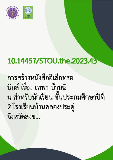 Abstract การศึกษาค้นคว้าอิสระครั้งนี้มีวัตถุประสงค์เพื่อ (1) สร้างหนังสืออิเล็กทรอนิกส์ เรื่อง เทพา บ้านฉัน สำหรับนักเรียนชั้นประถมศึกษาปีที่ 2 โรงเรียนบ้านคลองประดู่ จังหวัดสงขลา และ  (2) ศึกษาความคิดเห็นของนักเรียนชั้นประถมศึกษาปีที่ 2 โรงเรียนบ้านคลองประดู่ จังหวัดสงขลาที่มีต่อหนังสืออิเล็กทรอนิกส์ เรื่อง เทพา บ้านฉันกลุ่มตัวอย่าง ได้แก่ ผู้เชี่ยวชาญด้านภาษาไทย จำนวน 3 ท่าน ผู้เชี่ยวชาญด้านเทคโนโลยีการศึกษา จำนวน 3 ท่าน และนักเรียนชั้นประถมศึกษาปีที่ 2 โรงเรียนบ้านคลองประดู่ จังหวัดสงขลา จำนวน 11 คน เลือกแบบเจาะจง เครื่องมือที่ใช้ในการศึกษา ได้แก่ (1) หนังสืออิเล็กทรอนิกส์ เรื่อง เทพา บ้านฉัน สำหรับนักเรียนชั้นประถมศึกษาปีที่ 2 โรงเรียนบ้านคลองประดู่ จังหวัดสงขลา (2) แบบประเมินคุณภาพหนังสืออิเล็กทรอนิกส์ เรื่อง เทพา บ้านฉัน และ (3) แบบสอบถามความคิดเห็นของนักเรียน ชั้นประถมศึกษาปีที่ 2 ที่มีต่อหนังสืออิเล็กทรอนิกส์ เรื่อง เทพา บ้านฉัน  สถิติที่ใช้ในการวิเคราะห์ข้อมูล คือ ค่าเฉลี่ย และส่วนเบี่ยงเบนมาตรฐานผลการศึกษาปรากฏว่า (1) หนังสืออิเล็กทรอนิกส์ เรื่อง เทพา บ้านฉัน สำหรับนักเรียน ชั้นประถมศึกษาปีที่ 2 โรงเรียนบ้านคลองประดู่ จังหวัดสงขลา ประกอบด้วยเนื้อหาจำนวน 5 บท ได้แก่ ประวัติอำเภอเทพา สถานที่ท่องเที่ยวเชิงประวัติศาสตร์ สถานที่ท่องเที่ยวเชิงธรรมชาติ ของดีอำเภอเทพา และภูมินาม แต่ละบท มีคำอธิบายศัพท์ กิจกรรมท้ายบท และ (2) ผลตรวจสอบคุณภาพของหนังสืออิเล็กทรอนิกส์ที่สร้างขึ้น พบว่าผู้เชี่ยวชาญด้านภาษาไทยและผู้เชี่ยวชาญด้านเทคโนโลยีการศึกษา มีความเห็นว่าในภาพรวมมีความเหมาะสมอยู่ในระดับมากที่สุด และนักเรียนมีความคิดเห็นว่าหนังสืออิเล็กทรอนิกส์ในภาพรวมมีความเหมาะสมอยู่ในระดับมากที่สุด || The objectives of this independent study were to (1) create an e-book entitled the Story of Thepha, My Home Town for Grade 2 students at Ban Khlong Pradu School in Songkhla province; and (2) study the opinions of Grade 2 students at Ban Khlong Pradu School in Songkhla province towards the e-book entitled the Story of Thepha, My Hometown.The research sample consisted of three Thai language experts, three educational technology experts, and 11 Grade 2 students at Ban Khlong Pradu School in Songkhla province, all of whom were purposively selected.  The employed study tools were (1) an e-book entitled the Story of Thepha, My Hometown for Grade 2 students at Ban Khlong Pradu School in Songkhla province;  (2) a scale to assess quality of the e-book entitled the Story of Thepha, My Hometown; and  (3) a questionnaire on opinions of Grade 2 students towards the e-book entitled the Story of Thepha, My Hometown.  Statistics employed for data analysis were the mean, and standard deviation.The findings of the study revealed that (1) the e-book entitled the Story of Thepha,  My Hometown for Grade 2 students at Ban Khlong Pradu School in Songkhla province had contents comprising five chapters as follows: The History of Thepha District; Historical Tourist Attractions; Natural Tourist Attractions; Good Things of Thepha District; and Place Names; each chapter had a glossary and end-of-chapter activities; and (2) 