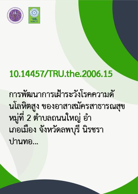 | Title | การพัฒนาการเฝ้าระวังโรคความดันโลหิตสูง ของอาสาสมัครสาธารณสุข หมู่ที่ 2 ตำบลถนนใหญ่ อำเภอเมือง จังหวัดลพบุรี / |