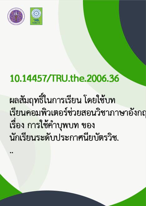 | Keyword | ผลสัมฤทธิ์ทางการเรียน, บทเรียนคอมพิวเตอร์ช่วยสอน, วิทยาลัยการอาชีพโคกสำโรง, ภาษาอังกฤษ |