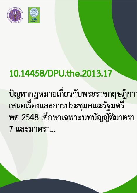 | Title | ปัญหากฎหมายเกี่ยวกับพระราชกฤษฎีกาว่าด้วยการเสนอเรื่องและการประชุมคณะรัฐมตรี พ.ศ. 2548 : |