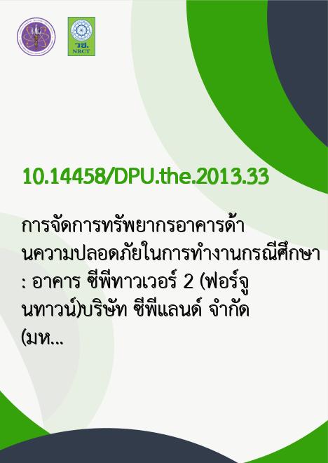 | Title | การจัดการทรัพยากรอาคารด้านความปลอดภัยในการทำงานกรณีศึกษา : อาคาร ซี.พี.ทาวเวอร์ 2 (ฟอร์จูนทาวน์)บริษัท ซี.พี.แลนด์ จำกัด (มหาชน) |
